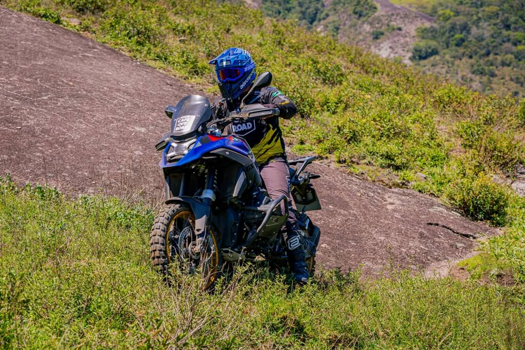 Workshop introdutório com orientações técnicas sobre condução em terrenos variados, postura de pilotagem, controle da motocicleta e técnicas de segurança.